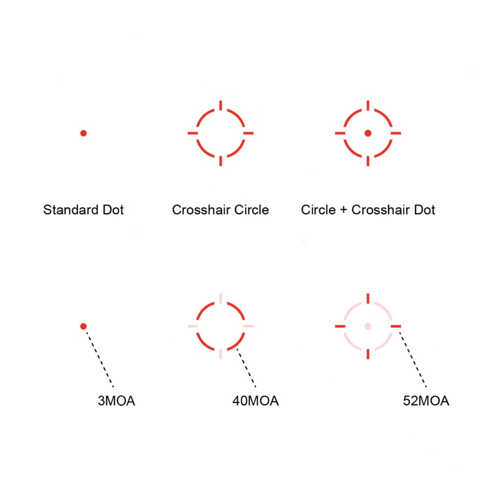 - Reticles: 3MOA dot, cirkel (40MOA), cirkel met dot